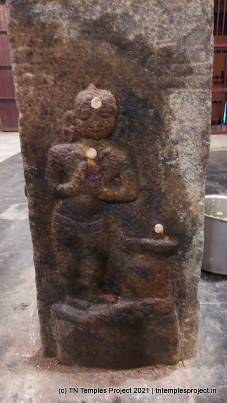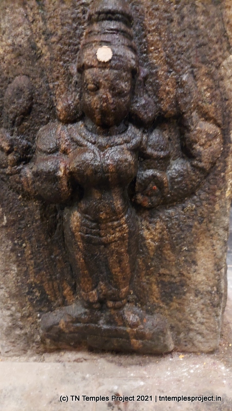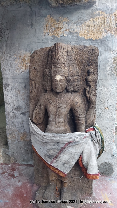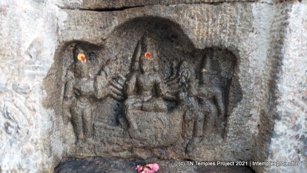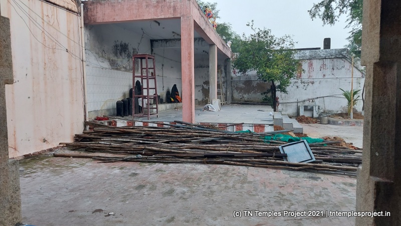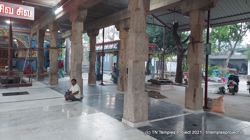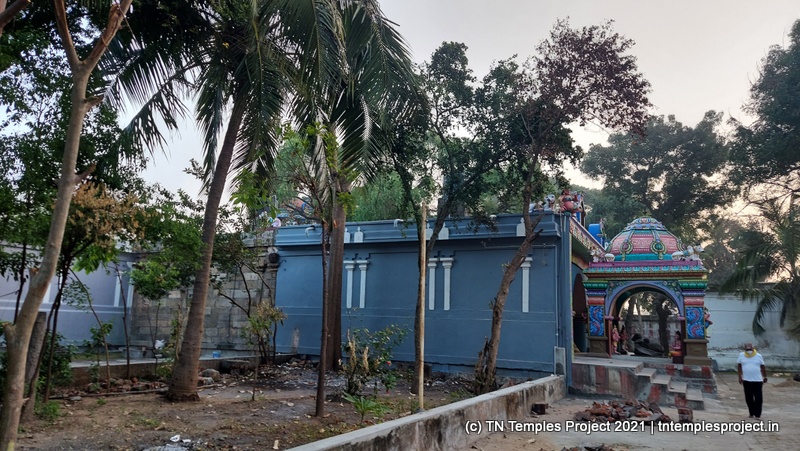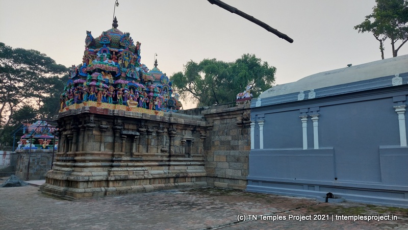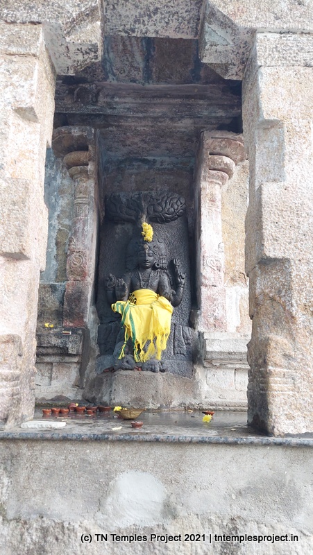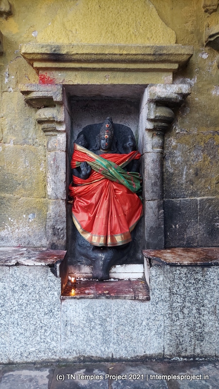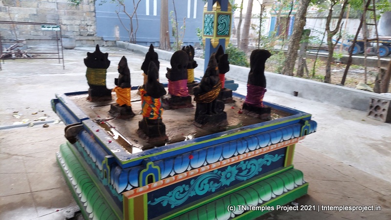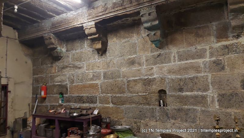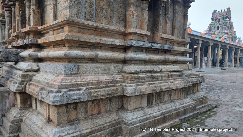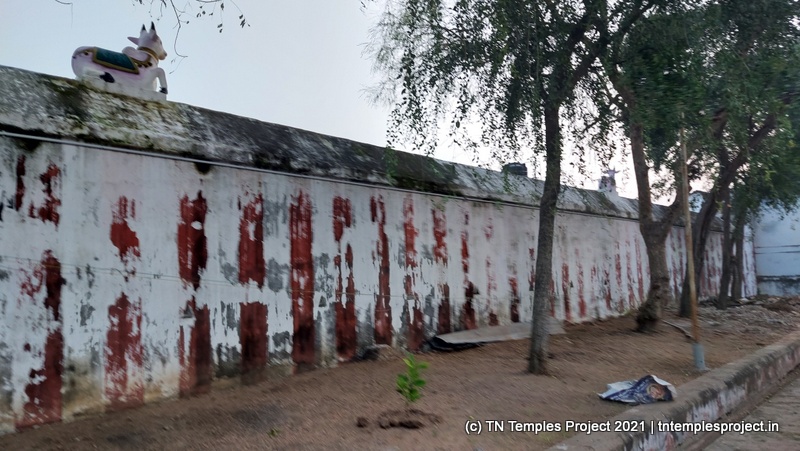 இக்கோயில் மேற்கு நோக்கி இருப்பதால், கோஷ்ட தெய்வங்களின் வரிசை வேறுபட்டது, எனவே நமக்கு வடக்கே துர்க்கை மற்றும் பிரம்மாவும், தெற்கில் தட்சிணாமூர்த்தியும் உள்ளனர். கோஷ்டத்தின் சுவர்களில் பல்வேறு அடிப்படை நிவாரணப் படங்கள் உள்ளன, குறிப்பாக பிரகாரத்தில், வடமேற்கில் இருந்து கடிகார திசையில் (நுழைவு மேற்கில் இருந்து) உள்ளன: சில பழைய லிங்கங்கள் மற்றும் தெய்வங்களுடன் ஒரு கொட்டகை, பஞ்ச முக ஆஞ்சநேயர் (அனுமன், குதிரை, யானை, நரசிம்மர் மற்றும் வராஹ முகங்களுடன்), சண்டிகேஸ்வரர். , விநாயகர், ஐயப்பன் மற்றும் தனி நவக்கிரகம் சன்னதி.