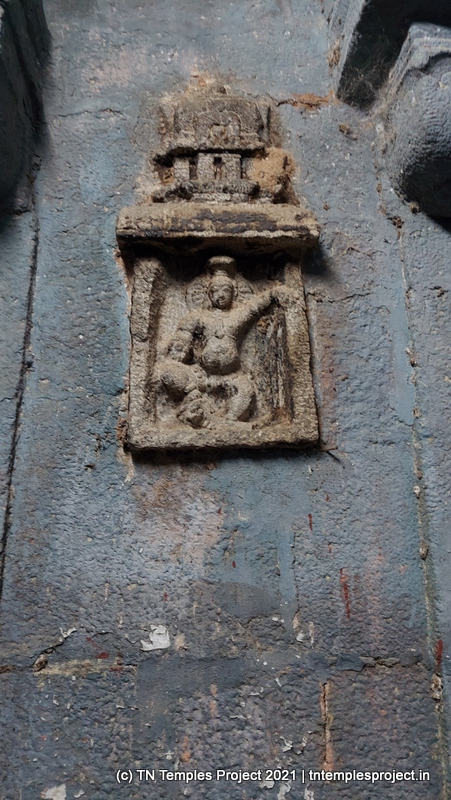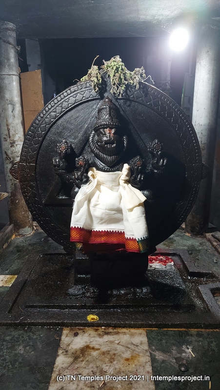 Perumal in the garbhagriham is in nindra kolam (standing) and is depicted with the prayoga chakram ready for use to protect His devotees. The gap between Perumal’s feet is regarded as the centre of the world, and the place from which He entered the ground as a boar, in the Varaha avataram.