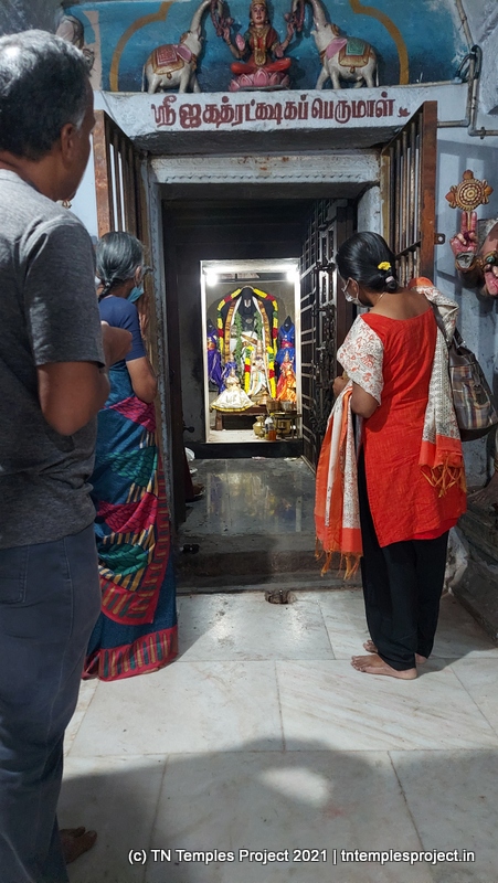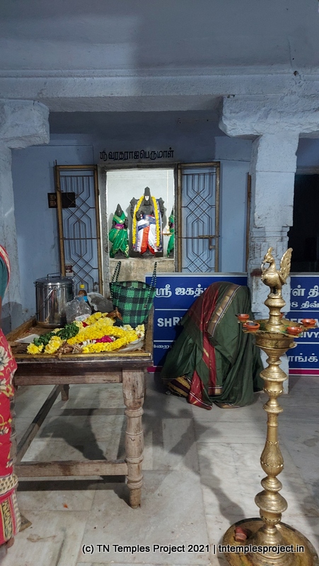 The temple is connected to the Varaha avataram of Vishnu. Hiranyaksha the demon had taken Bhudevi – Mother earth Herself – to the depths of the sea. The devas all gathered here to worship the Lord, before He took the Varaha avataram and rescued Bhudevi. Vishnu protected and rescued Bhudevi, and thereby the entire world. He is therefore named Jagat Rakshaka Perumal (which is Vaiyam Katha Perumal in Tamil). Tirumangaiazhvar has done mangalasasanam at this temple, and in his pasuram, refers to this place as Pugundha Oor, ie the place where Vishnu entered patala loka to retrieve Bhudevi.