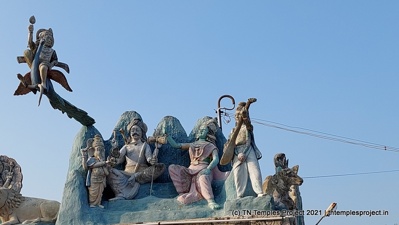 அம்மன் சன்னதியின் தெற்கு வாசலில், மகா மண்டபத்தின் உச்சியில், கைலாசக் காட்சியின் அழகிய பூச்சுப் பிரதிபலிப்பு, முருகன் தனது மயிலின் மீது தெற்கு நோக்கிச் செல்லும் காட்சியை சித்தரிக்கிறது, விநாயகர் சிவன் மற்றும் பார்வதியிடம் இருந்து மாம்பழத்தைப் பெற்றார். அவனது உலகத்தின் மூன்று சுற்றுகள்!