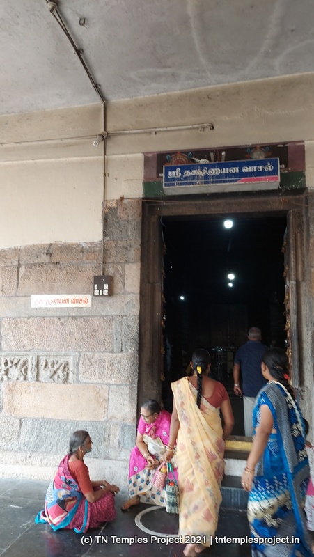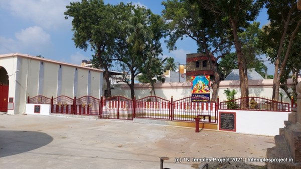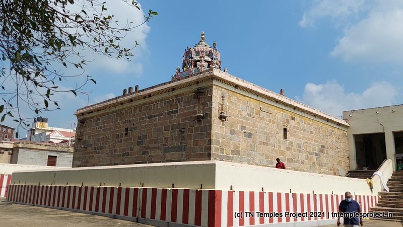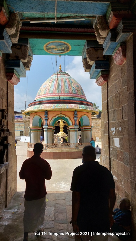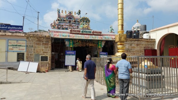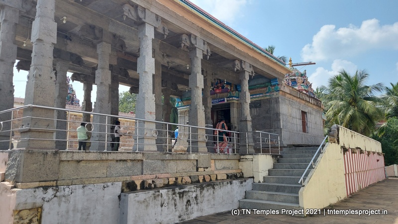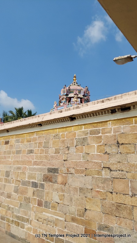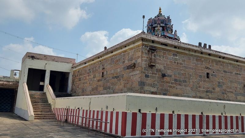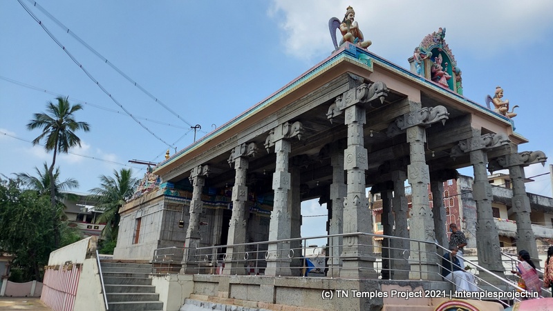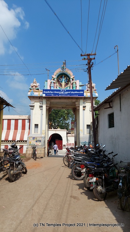 கோவிலுக்கு இரண்டு நுழைவாயில்கள் உள்ளன – கிழக்கில் பிரதானமானது 5-நிலை ராஜகோபுரத்துடன், தெற்கிலிருந்து சிறியது. கோபுரத்திற்குப் பிறகு ஒரு அலங்கரிக்கப்பட்ட வட்ட மண்டபம் உள்ளது, அதைத் தொடர்ந்து பலி பீடம் மற்றும் த்வஜஸ்தம்பம் உள்ளது. கோயில் குளம் ராஜகோபுரத்திற்கு அருகில் வடக்குப் பகுதியில் அமைந்துள்ளது. தெற்கு நுழைவாயிலுக்கு மேலே உள்ள நுழைவு வளைவில் பெருமாள் எட்டு கரங்களுடன் சக்ரபாணியாக ஸ்டக்கோ படம் உள்ளது.