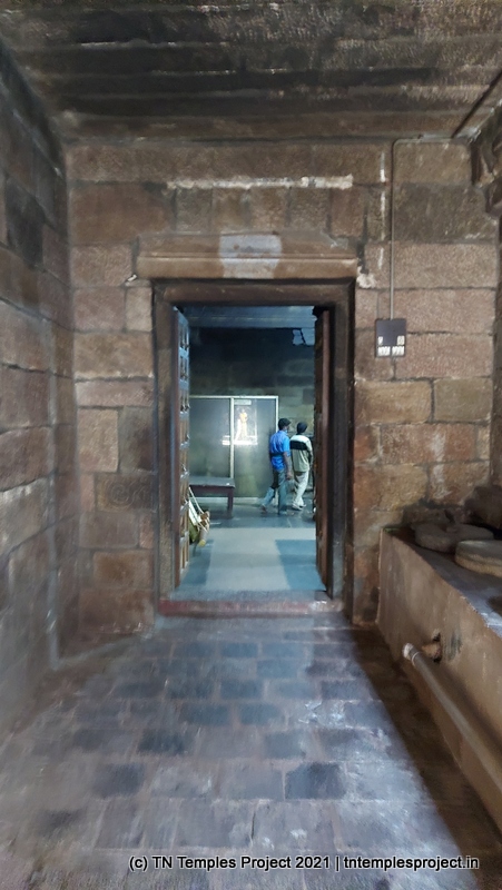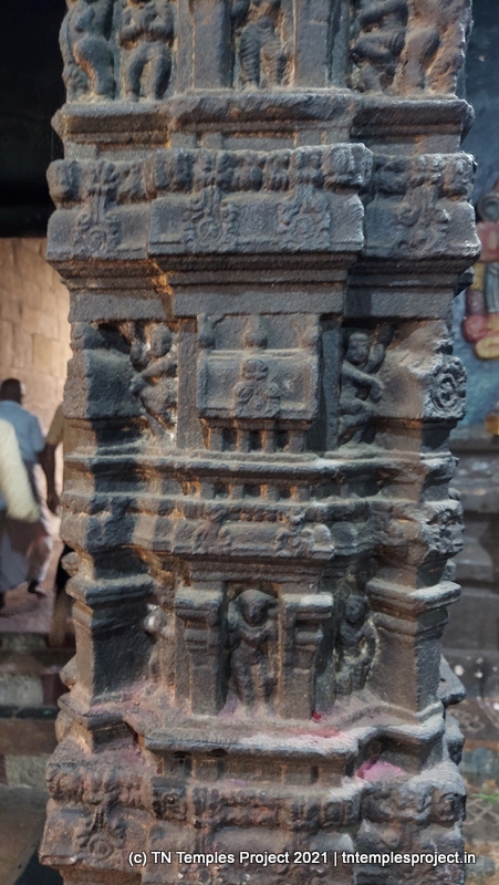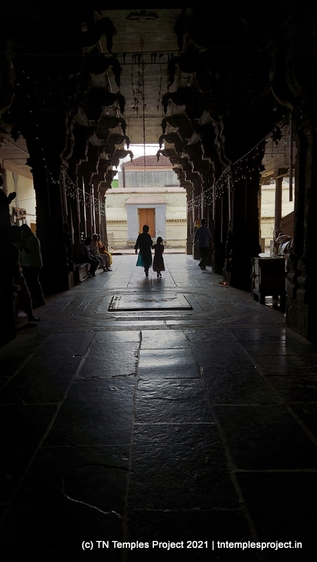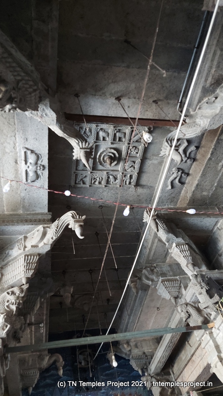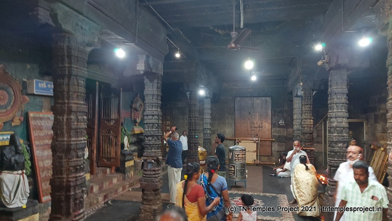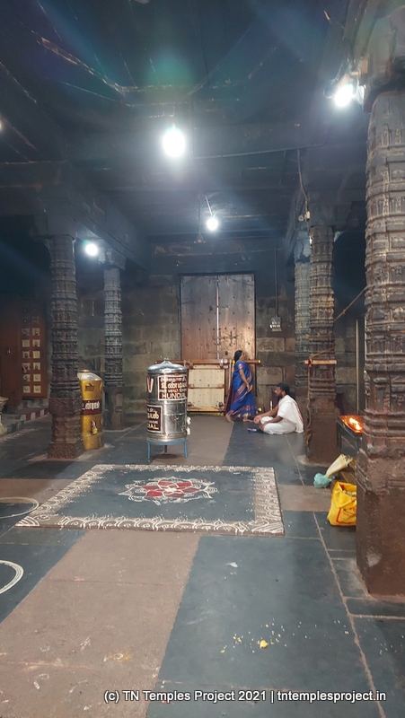 நுழைவாயிலில் ஒரு மண்டபம் உள்ளது, அதைத் தொடர்ந்து உள் பிரகாரம் உள்ளது. இடதுபுறத்தில் மேல் மட்டத்திற்குச் செல்லும் படிக்கட்டுகள் உள்ளன, பல பெருமாள் கோயில்களைப் போலவே, இரண்டு நுழைவாயில்கள் உள்ளன – வடக்கு மற்றும் தெற்கில் ஒவ்வொன்றும், உத்தராயணம் மற்றும் தட்சிணாயனத்தின் போது பயன்படுத்தப்படுகின்றன. இந்த நுழைவாயில்கள் ஒரு மண்டபத்திற்கு இட்டுச் செல்கின்றன. மண்டபத் தூண்களில் உள்ள சிற்பங்கள் கண்கவர்கின்றன! இங்கிருந்து உள் பிரகாரம் மற்றும் சக்ரராஜா தனது பக்தர்களுக்கு அருள்பாலிக்கும் கர்ப்பகிரஹத்திற்கு செல்லும் வழி. கர்ப்பகிரஹத்தில் பிரம்மா, சூரியன், அக்னி ஆகியோர் பெருமாளைத் தொழுத வண்ணம் உள்ளனர். இந்த தலத்தில் உள் பிரகாரம் உள்ளது, அதில் லட்சுமி நரசிம்மர், தும்பிக்கை ஆழ்வார் (விநாயகர்), லட்சுமி நாராயணர், பஞ்சமுக