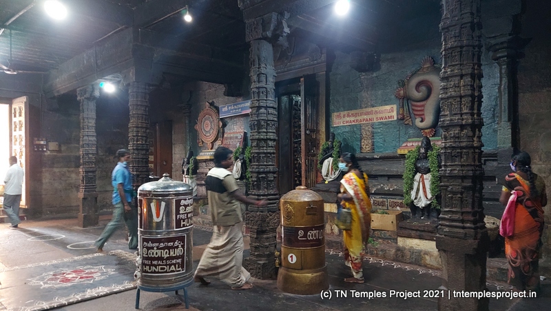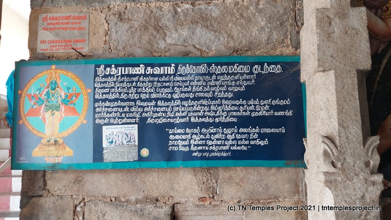 கும்பகோணத்தின் கதை மற்றும் மகாமகம் திருவிழாவுடன் தொடர்புடைய 12 சிவன் கோயில்கள் தவிர, ஐந்து பெருமாள் கோயில்களும் குளத்துடன் இணைக்கப்பட்டுள்ளன – சார்ங்கபாணி கோயில், சக்ரபாணி கோயில் (இந்த கோயில்), ராஜகோபாலஸ்வாமி கோயில், வராஹப் பெருமாள் கோயில் மற்றும் ராமசுவாமி கோயில். கோவில். இந்த ஐந்து கோவில்களும் சேர்ந்து ஒரு திவ்ய தேசம் என்று ஒரு தவறான நம்பிக்கை உள்ளது.