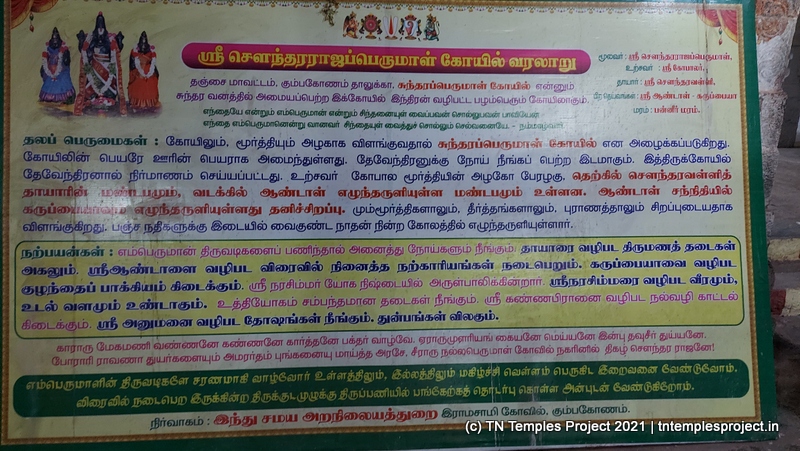 கடைசியாக 1939 ஆம் ஆண்டு சம்ப்ரோக்ஷணம் செய்யப்பட்டது என்பதை நாங்கள் புரிந்துகொண்டோம். சமீப ஆண்டுகளில், கோயிலின் சில அம்சங்களை மீட்டெடுக்க சில முயற்சிகள் மேற்கொள்ளப்பட்டன – (தொடங்குவதற்கு ஒன்றிரண்டு விமானங்கள்) – ஆனால் வேலை நிறுத்தப்பட்டது அல்லது நத்தை வேகத்தில் நடந்து வருகிறது. ஒரு பாலாலயமும் கட்டப்பட்டது ஆனால் சம்ப்ரோக்ஷணம் இதுவரை நடக்கவில்லை. சில ஆண்டுகளுக்கு முன்பு அர்ப்பணிக்கப்பட்ட ஸ்ரீ சுந்தரராஜ பட்டர் காலமான பிறகு, கோவிலை பராமரிப்பு மிகவும் குறைவாகவே சென்றது.