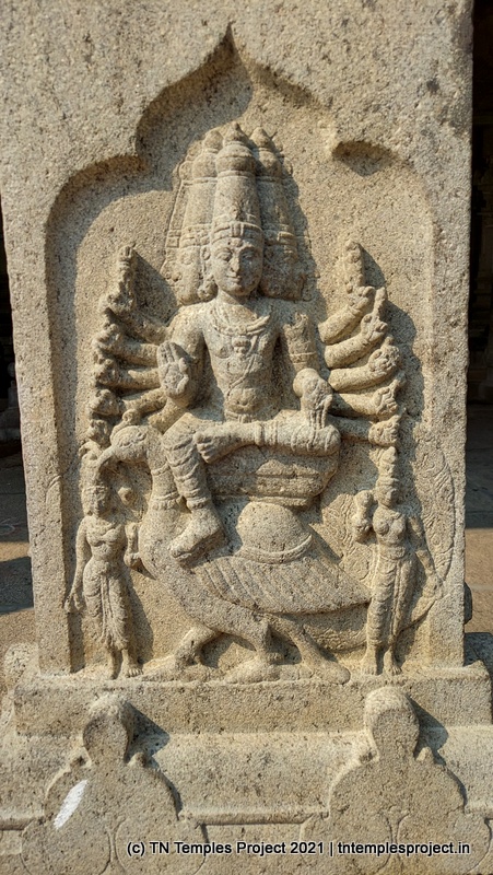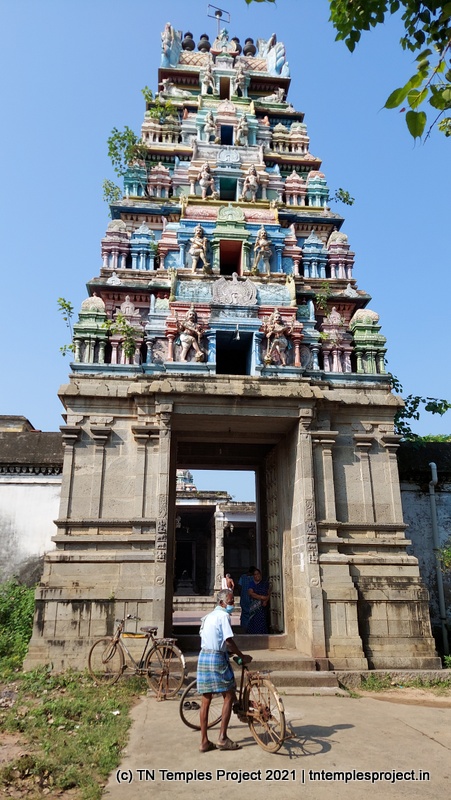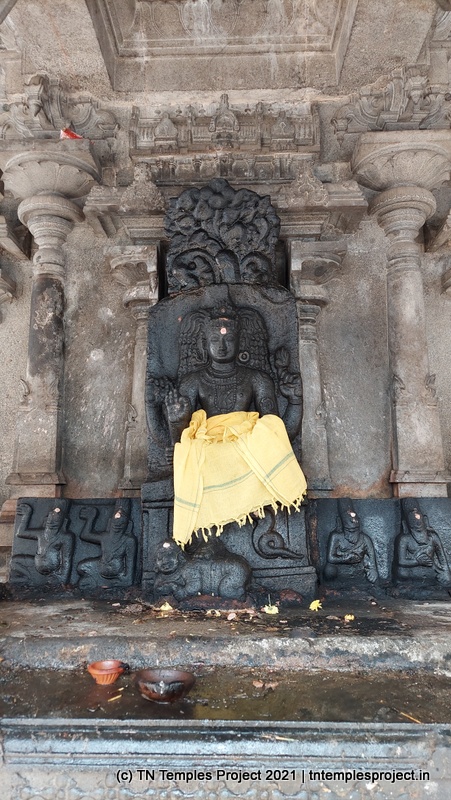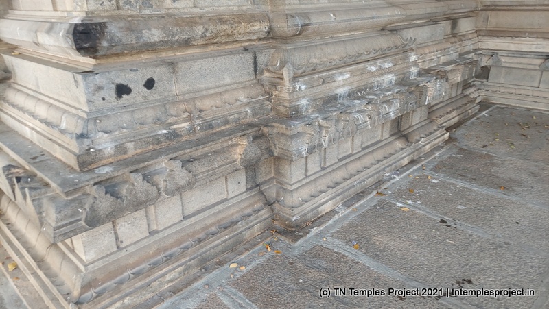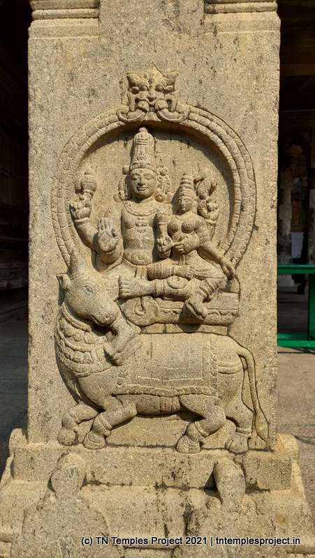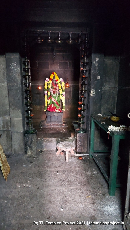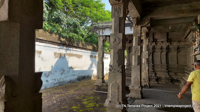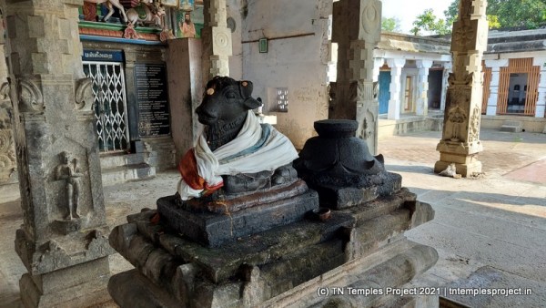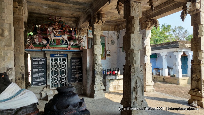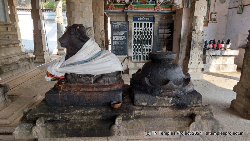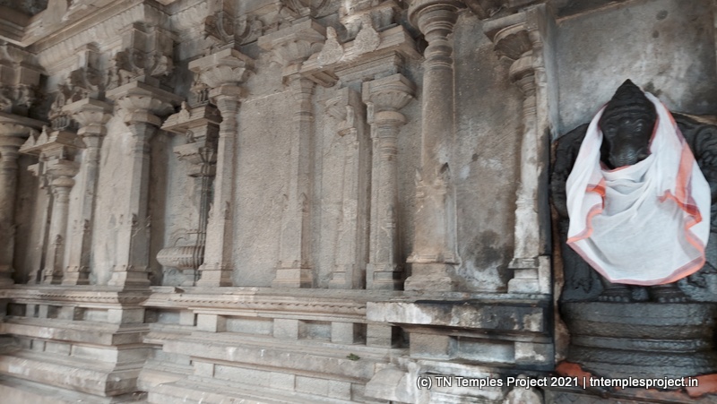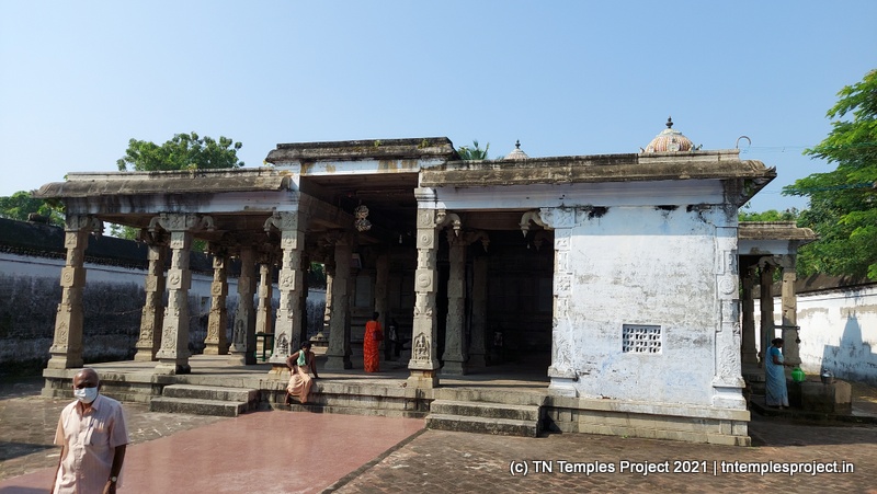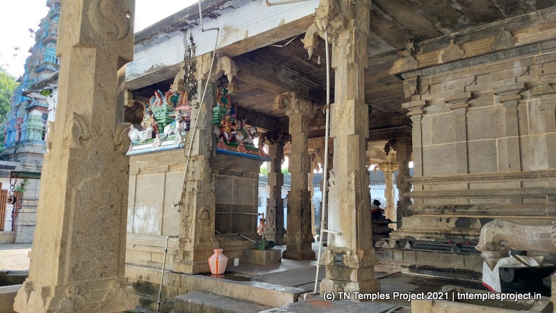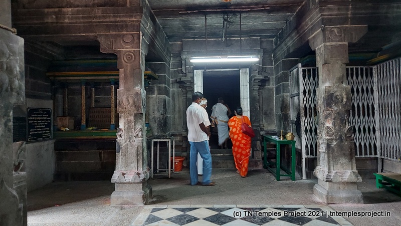 ராஜகோபுரம் வழியாக நுழைந்ததும், சிறிது தூரம் நடந்தால், தட்டையான கூரையுடன் கூடிய மண்டபம். இங்கு துவஜஸ்தம்பம் இல்லை, ஆனால் பலி பீடம் மற்றும் நந்தி மண்டபம் மட்டுமே உள்ளது. மண்டபத்தின் தூண்களில் சில நுணுக்கமான மற்றும் அழகான வேலைப்பாடுகள் மற்றும் அடித்தள சிற்பங்கள் உள்ளன. அர்த்த மண்டபத்தின் நுழைவாயிலின் இருபுறமும் இத்தகைய சிற்பங்கள் உள்ளன. அர்த்த மண்டபத்தில், நேராக கர்ப்பக்கிரகம் உள்ளது, அம்மன் சன்னதி வலதுபுறம், தெற்கு நோக்கி உள்ளது.