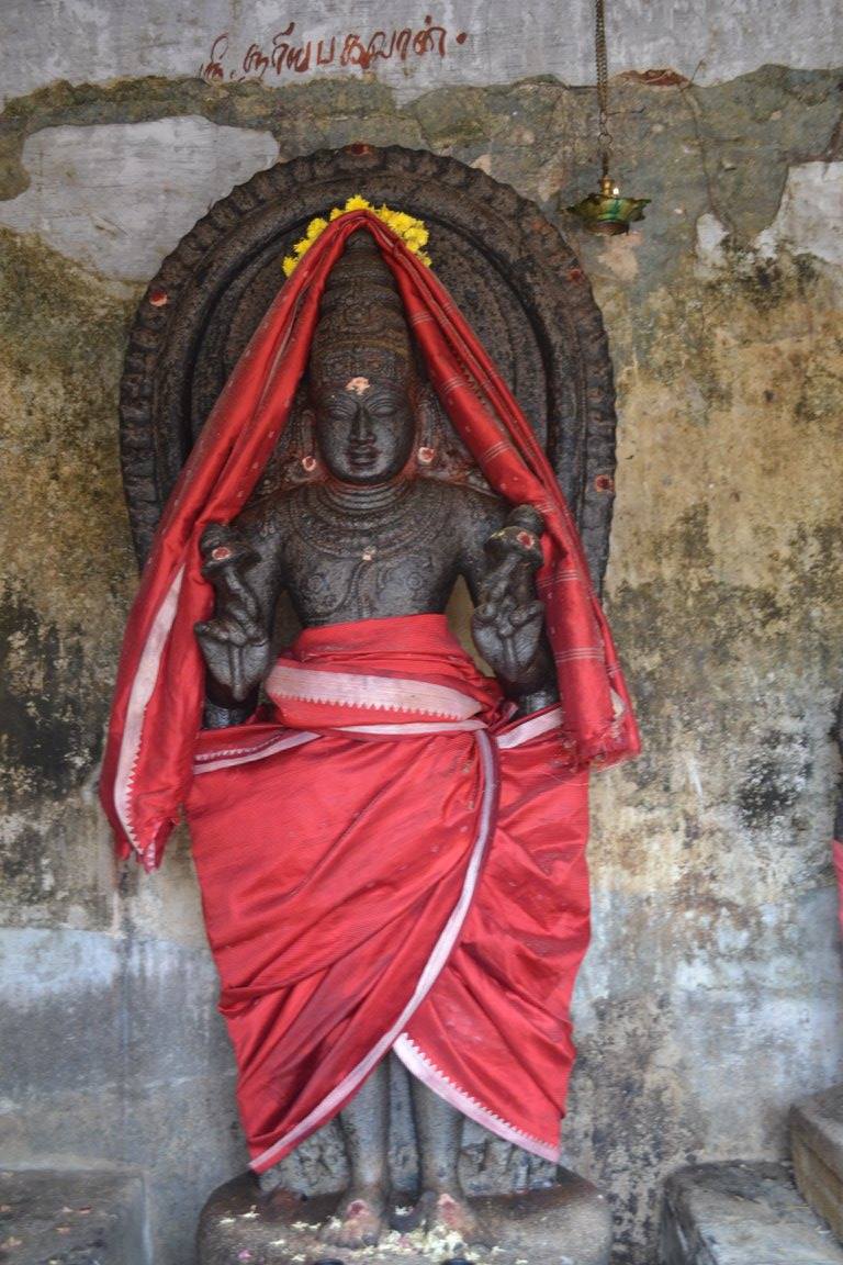 In the north-east portion of the temple is a dilapidated mandapam which previously housed a south-facing Bhairavar, which is extremely rare / unusual. Worshipping this Bhairavar is said to help dispel all of one’s troubles and worries. The corridor in the eastern part of the temple also housed two Naagar vigrahams and Sani. Two bas reliefs – one of Purushamriga, and another depicting Purushamriga’s fight with Bhima (from the Mahabharatam) – were also housed in this corridor. There were also rather tall, and finely crafted, vigrahams of Suryan and Murugan.