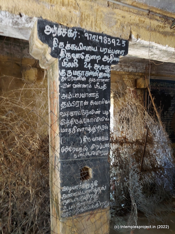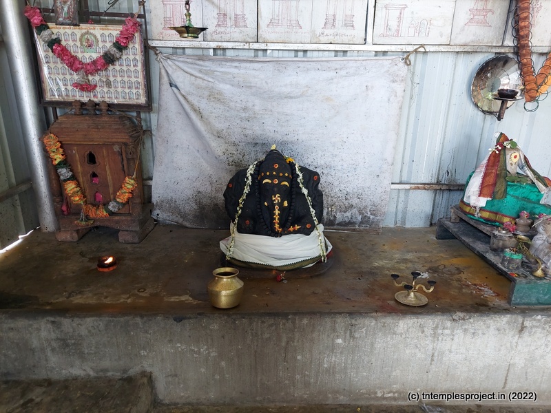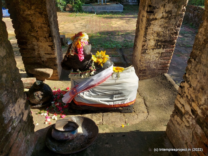 There is no dhwajasthambam today, but it may have existed earlier, given the presence of a kodimaram Vinayakar in front. Beyond this is a bali peetham and Nandi mandapam. During our visit in April 2022, we noticed that the Nandi was properly decorated, indicating that pradosham puja had been performed the previous day.