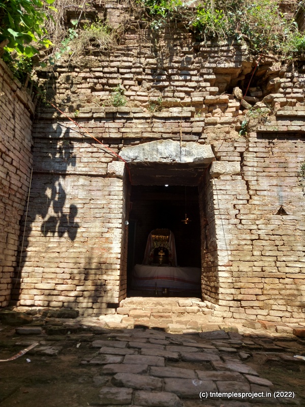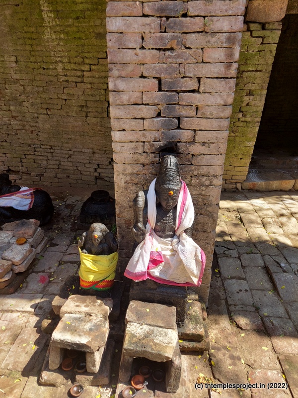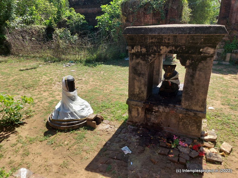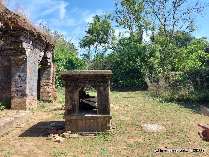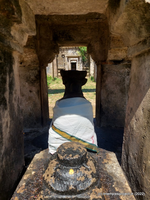 Because the temple is not structurally sound, even locals are not allowed to enter the garbhagriham. However, the priest who performs the pujas here (sometimes every day, and sometimes on alternate days) keeps the garbhagriham neat and clean. On the right of the ardha mandapam is the south-facing Amman shrine. As one comes around the temple, there is a Dakshinamurti shrine (with no vigraham inside). There are no koshtam deities or other sub-shrines in the prakaram, except the empty Chandikeswarar shrine.