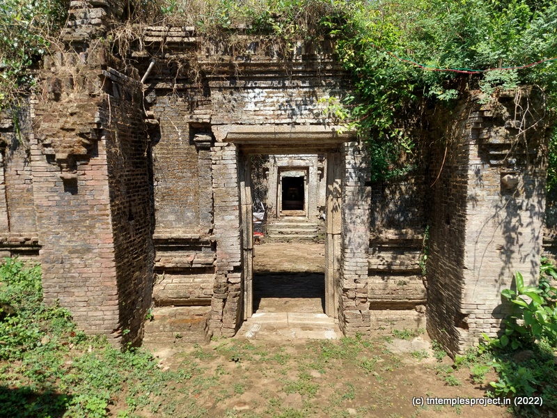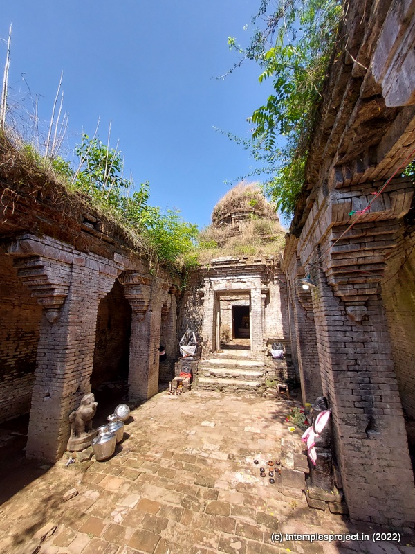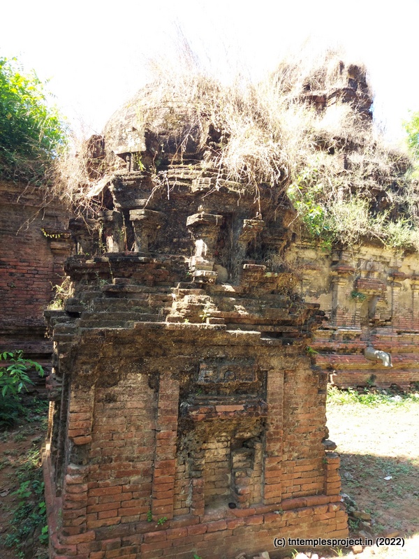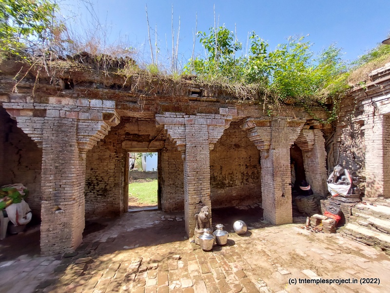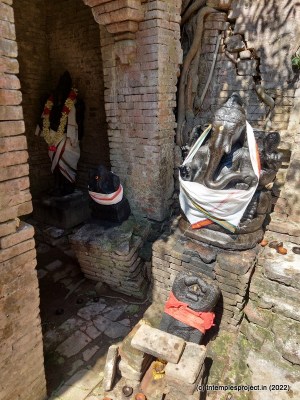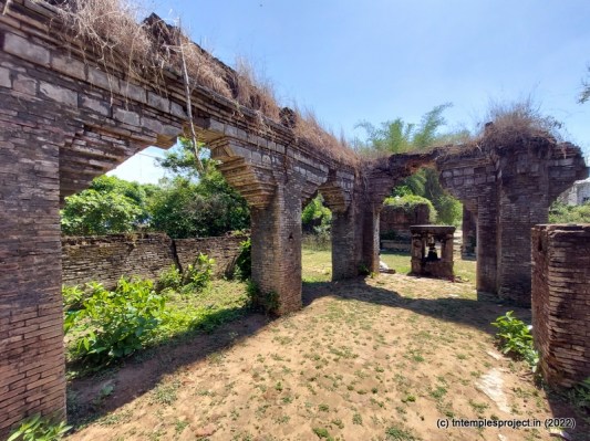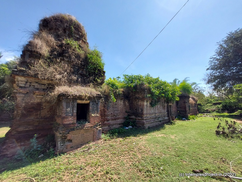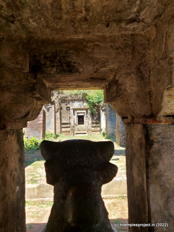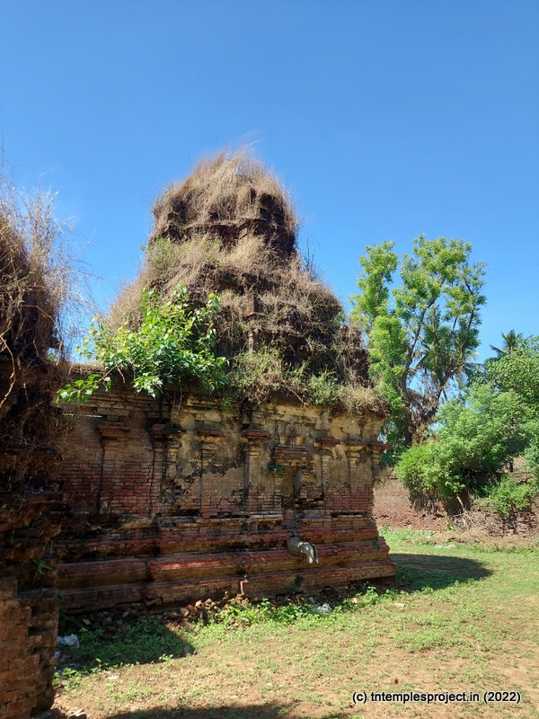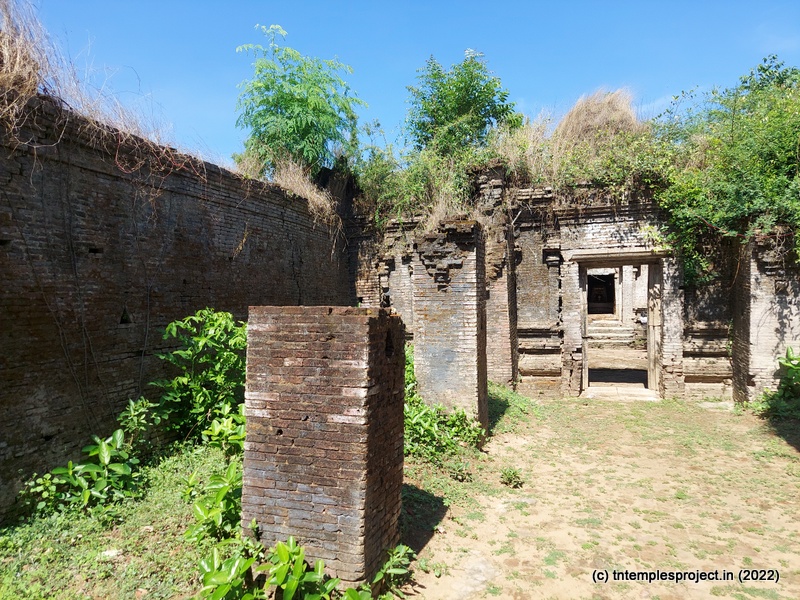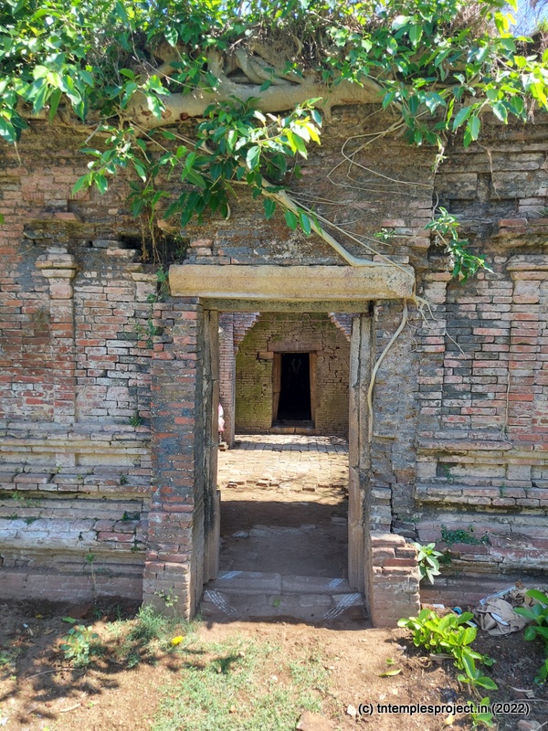 Ahead is a crumbling, roofless structure of what would have been a glorious maha mandapam, featuring a pillared corridor that leads to the ardha mandapam. The ardha mandapam similar features brick pillars on both sides, with some murtis placed near them (a half yali, Dakshinamurti and Chandikeswarar). The entrance to the garbhagriham is flanked by Vinayakar and Murugan. On either side are corridors, and a vigraham of Vishnu is on the left while on the right is a separate Siva Lingam with its own Nandi.
