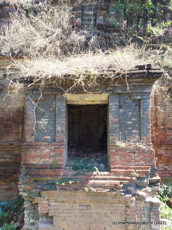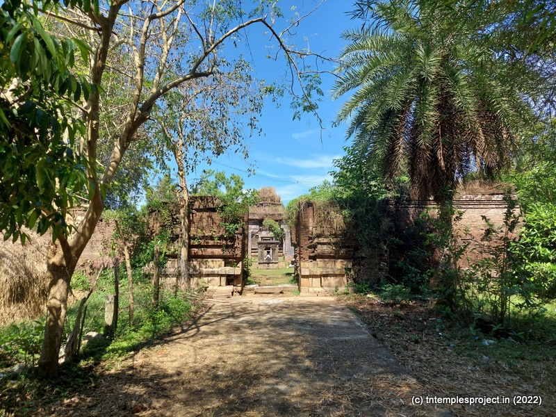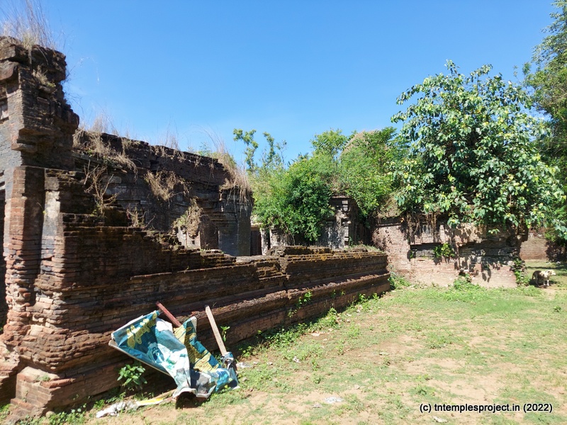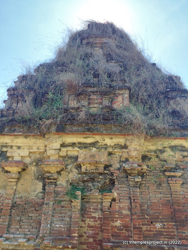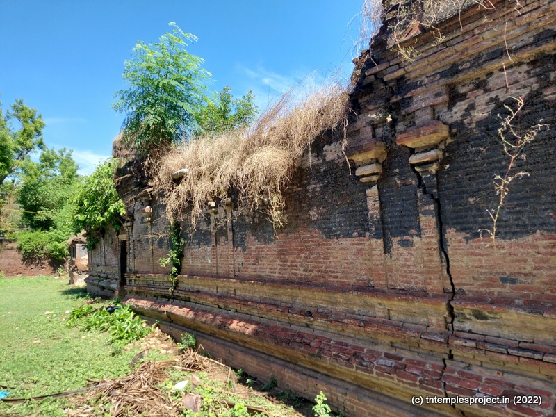 Today, the temple is in an absolutely pathetic state of dilapidation, and continues to lie uncared for. A long cement path from the village road leads us to the gap between the walls that would have housed a majestic raja gopuram a thousand years ago. The base of this structure is stone – clearly indicating the Chola influence on this temple – while the rest of what’s left of the gopuram is made of thin bricks. This feature is seen throughout the temple (more on that below).