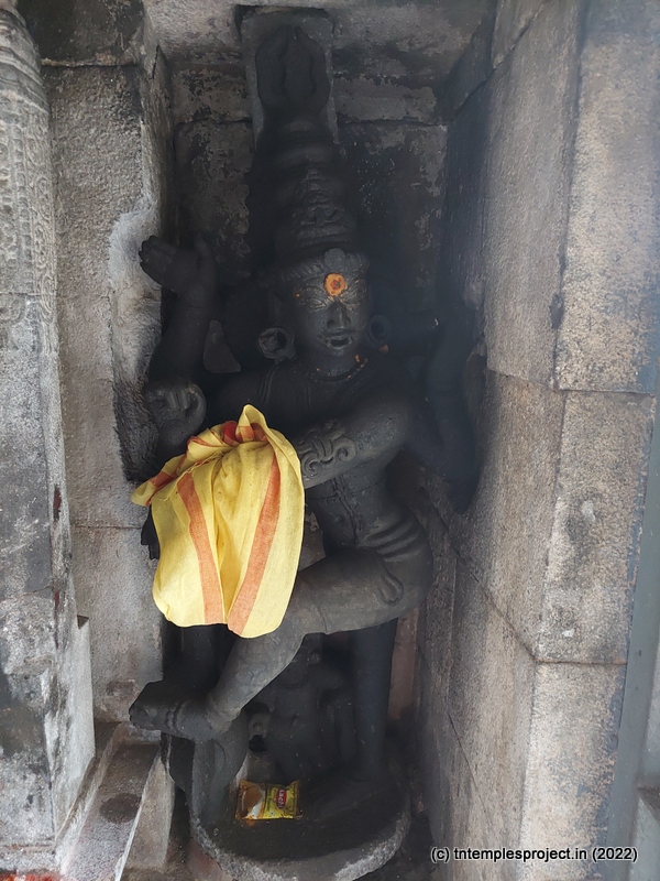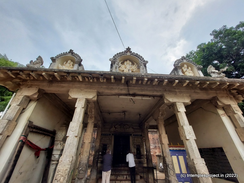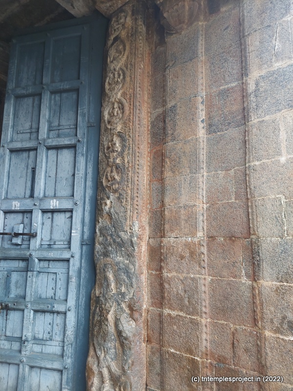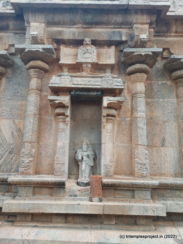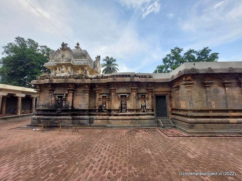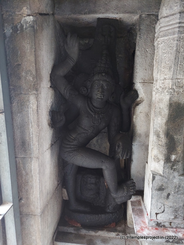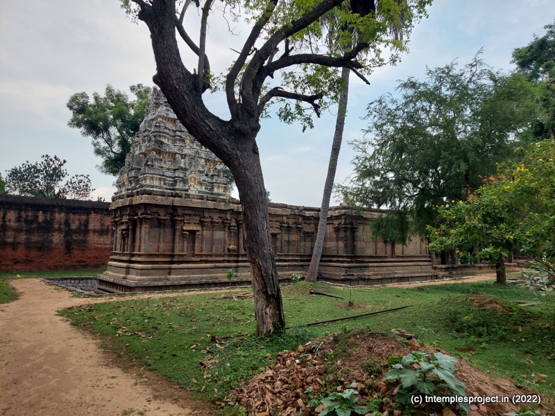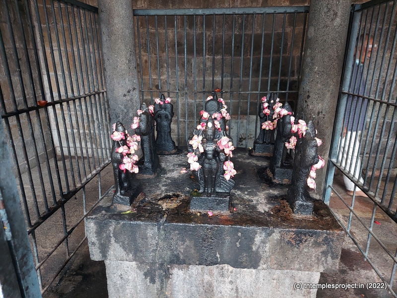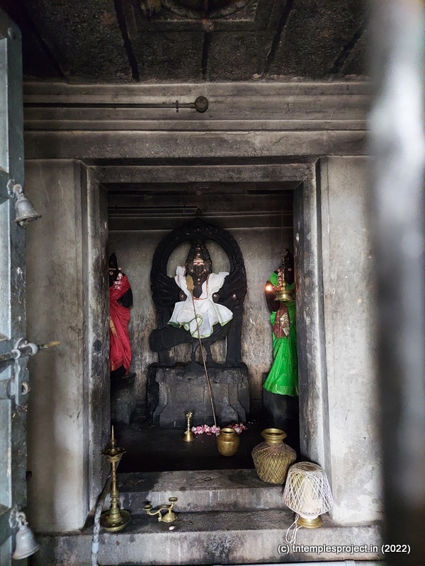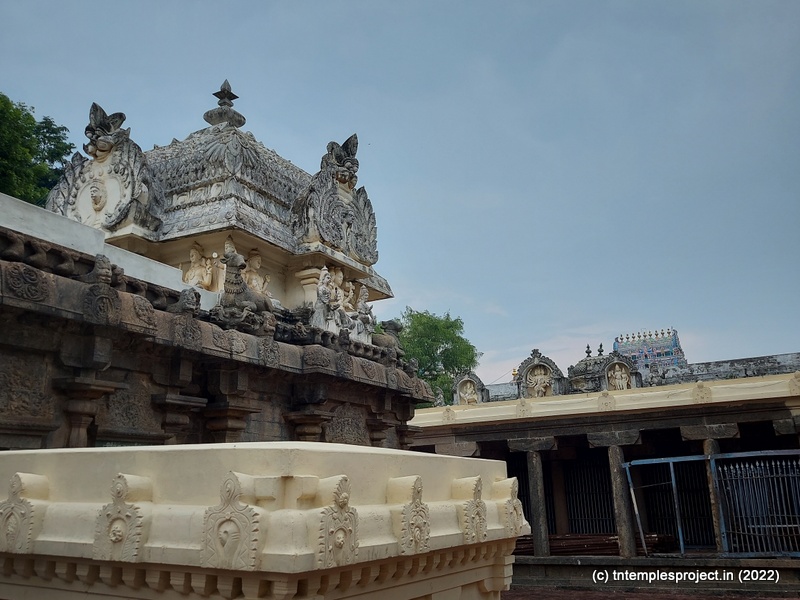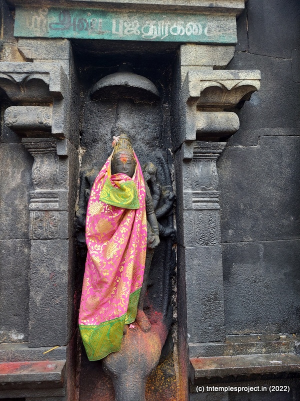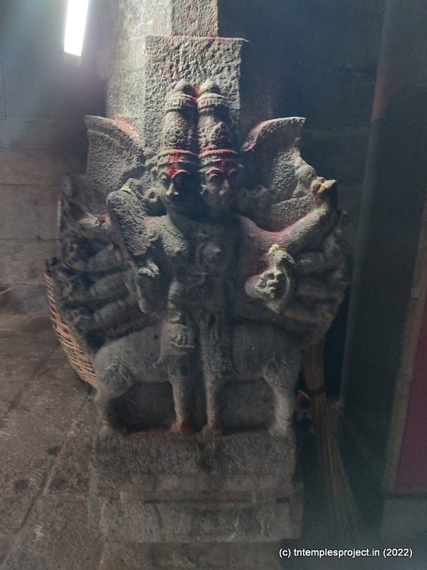 Nine vigrahams adorn the koshtams around the sanctum – Vinayakar, Uma Maheswarar, Agastyar, Dakshinamurti, Lingodhbhavar, Brahma, Ardhanareeswarar, and Ashta Bhuja Durgai are beautifully sculpted, while the ninth is an unidentifiable mass of stone. There are also several inscriptions on the outer walls of the garbhagriham.