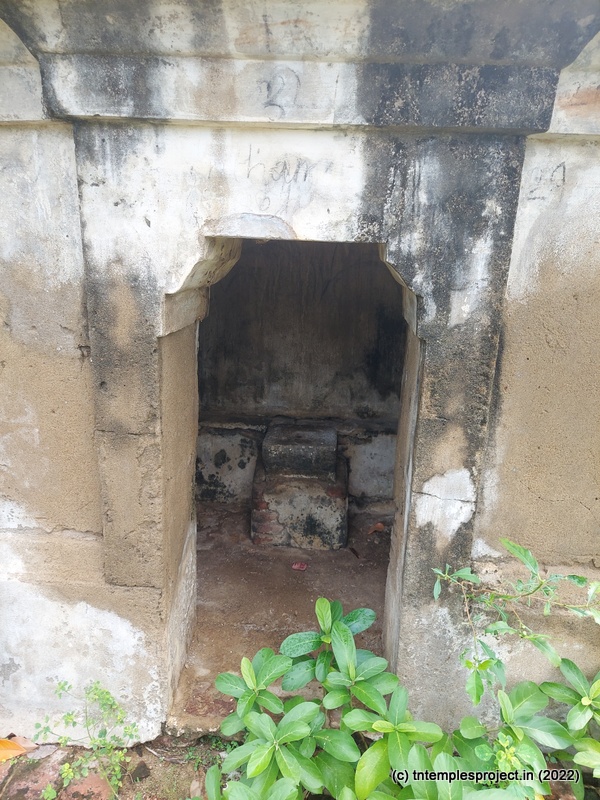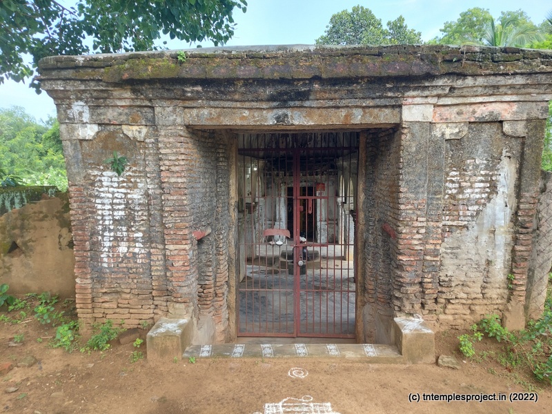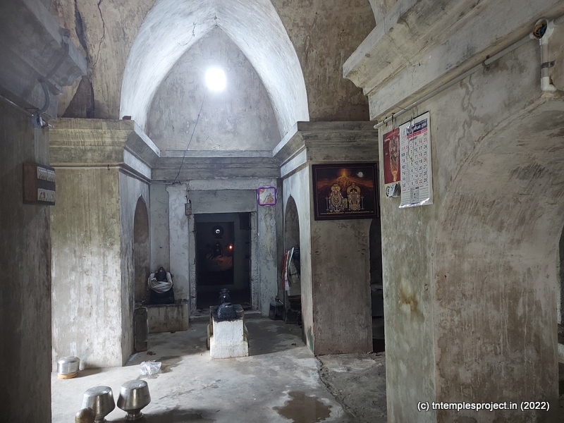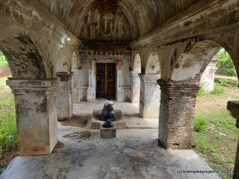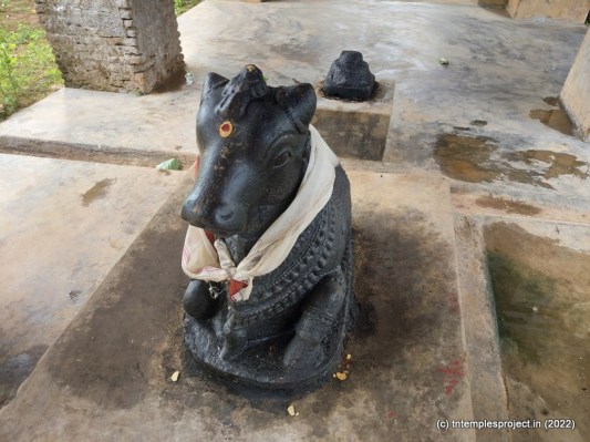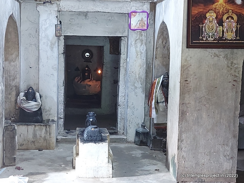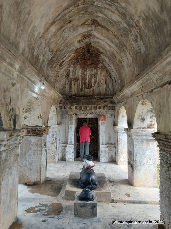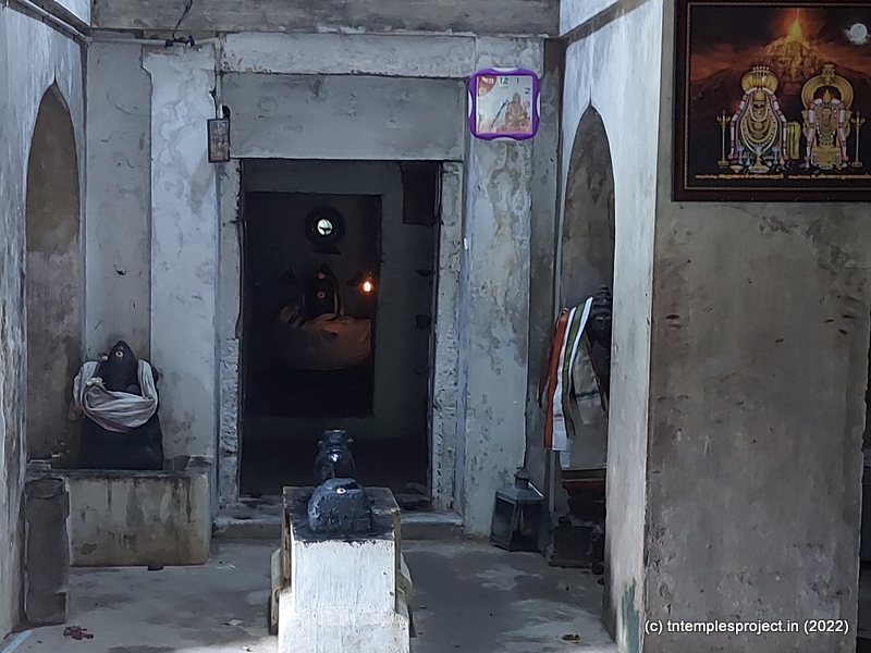 The broken compound walls tell the story of neglect. The temple does not have a gopuram, but has an entrance arch. Perhaps in the days of yore, this may have been a proper gopuram. A long, covered vavvaal nethi mandapam leads to the ardha mandapam, and also houses a bali peetham and Nandi. Inside the ardha mandapam are the east-facing garbhagriham with Vinayakar and Murugan flanking the entrance, as well as a separate Nandi in front of the moolavar; and a south facing Amman shrine.