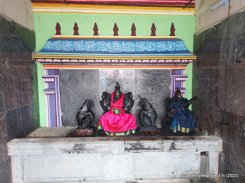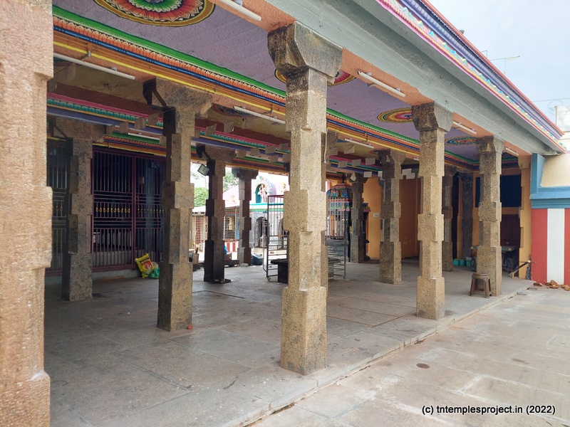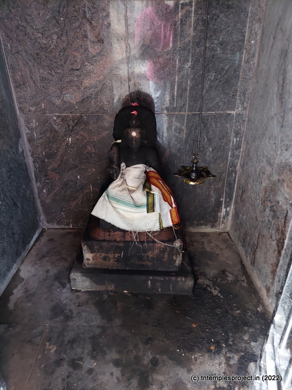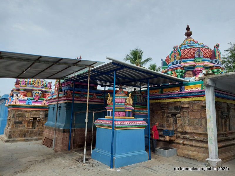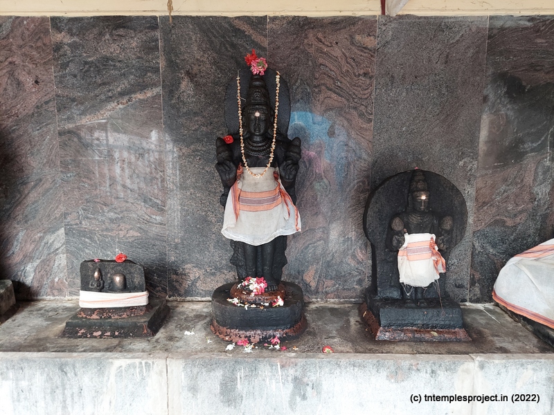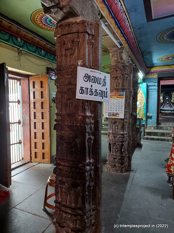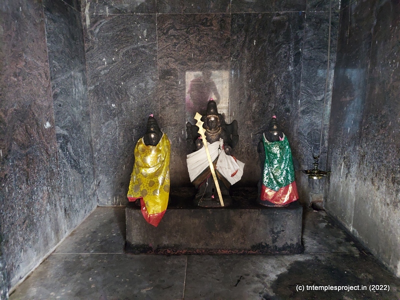 As we come around the prakaram, there are bas relief sculptures on several pillars in the temple. The koshtams are, however, empty except for Dakshinamurti. In the prakaram are Vinayakar, Murugan with his consorts Valli and Deivanai, a shrine for Gajalakshmi and Saraswati, a separate shrine abutting the garbhagriham wall, for Vishnu Durga, and a Chandikeswarar. The architecture is old, but lacks detailing that is usually abundant in Chola temples. On the eastern side are Bhairavar, Nagarajar, Hariharaputran, Suryan and Chandran. In the northeast corner is a navagraham shrine.