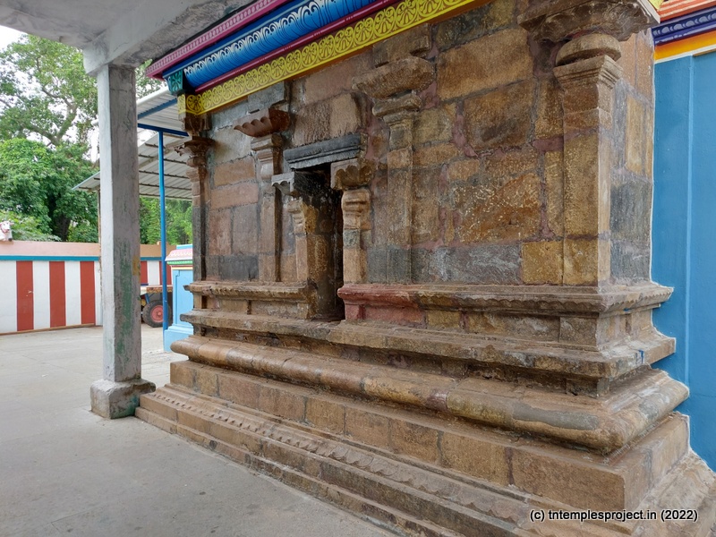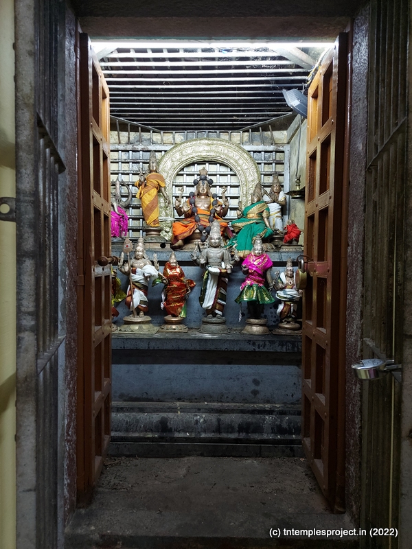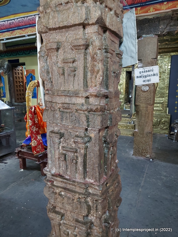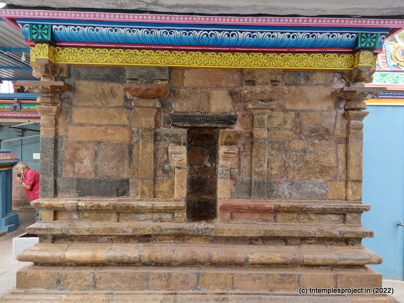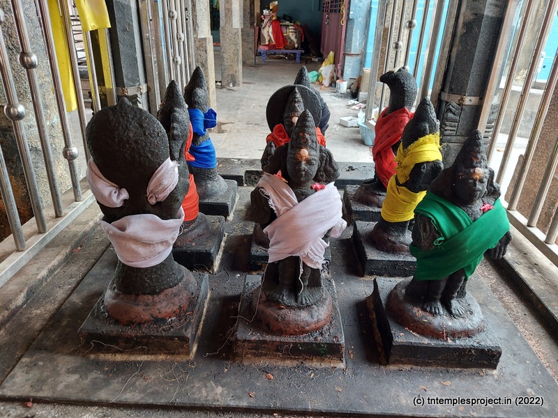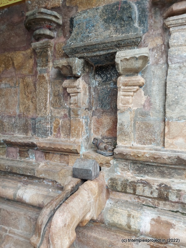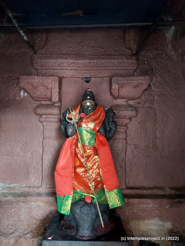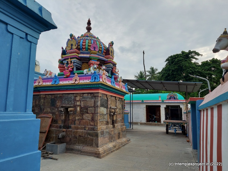 As we come around the prakaram, there are bas relief sculptures on several pillars in the temple. The koshtams are, however, empty except for Dakshinamurti. In the prakaram are Vinayakar, Murugan with his consorts Valli and Deivanai, a shrine for Gajalakshmi and Saraswati, a separate shrine abutting the garbhagriham wall, for Vishnu Durga, and a Chandikeswarar. The architecture is old, but lacks detailing that is usually abundant in Chola temples. On the eastern side are Bhairavar, Nagarajar, Hariharaputran, Suryan and Chandran. In the northeast corner is a navagraham shrine.