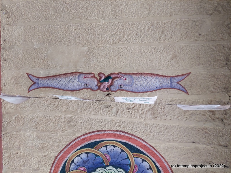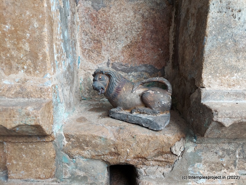 From the eastern entrance is a long, covered passage like a mandapam, which has a bali peetham and pradosha Nandi, and leads to the maha mandapam. Inside the long maha mandapam, on the right is the Amman shrine and straight ahead is the garbhagriham. Interestingly, on the ceiling is an image of what appears to be two fish of some sort facing each other, suggesting there may have bene some Pandya involvement in renovating this temple. One of the sculptures here is also of Vikrama Chola worshipping Lord Siva.