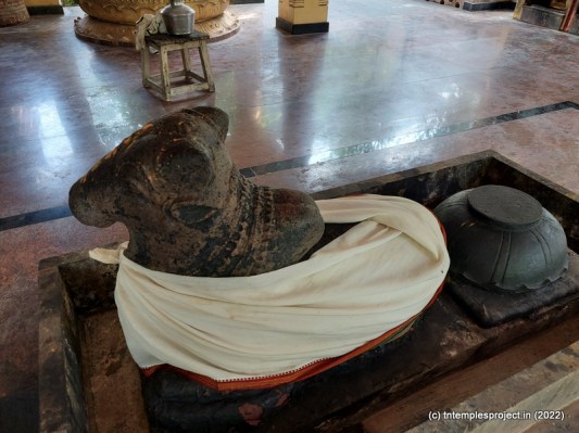 The maha mandapam itself has various plaster cast sculptures on the roof. In the maha mandapam are a bali peetham and Nandi, and the shrines for Chozheeswaramudaiyar and the south-facing shrine for Vedanta Nayaki Amman. The moolavar’s shrine is flanked by Vinayakar and Murugan. There is no dhwajasthambham at this temple. The moolavar lingam is extremely old, although at the time of the temple’s rebuilding in 2014, the avudai was replaced.