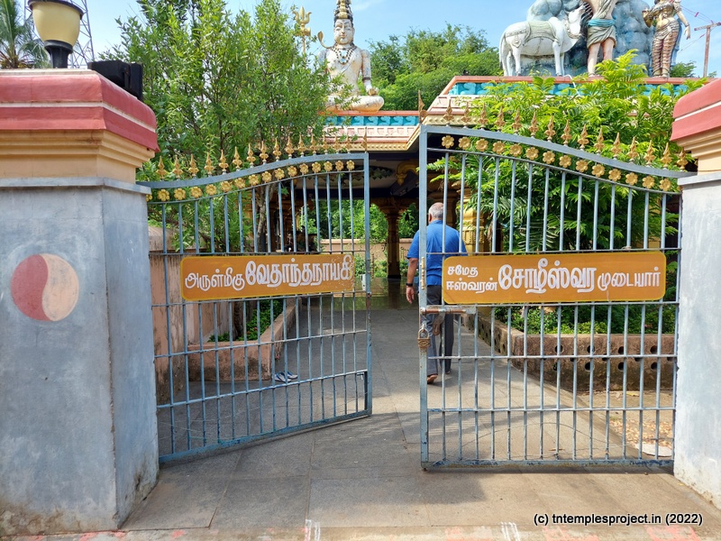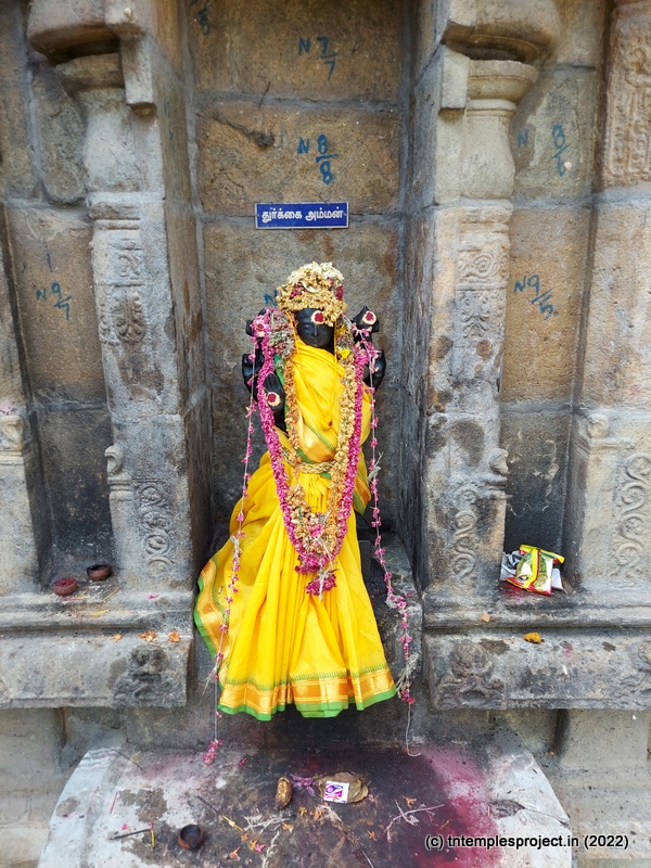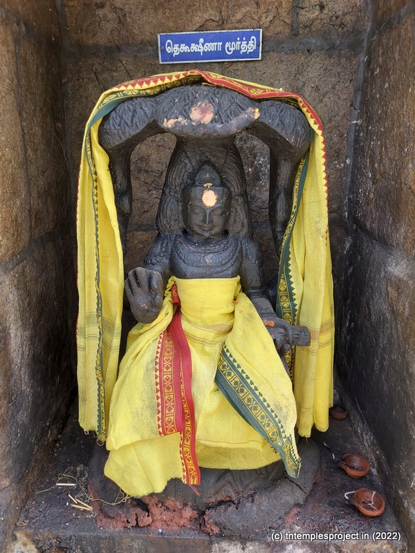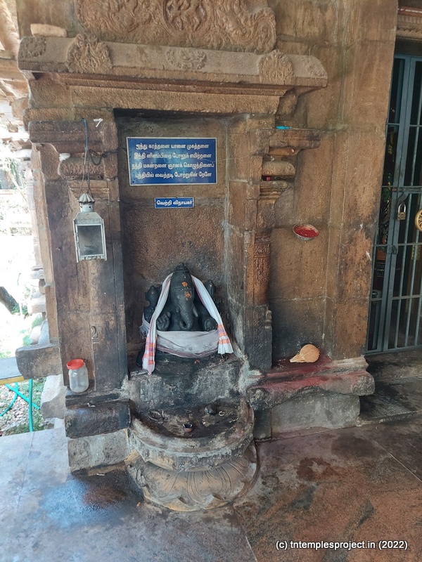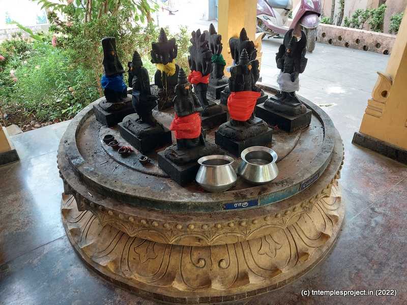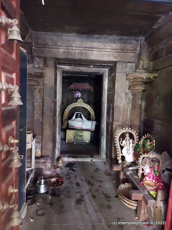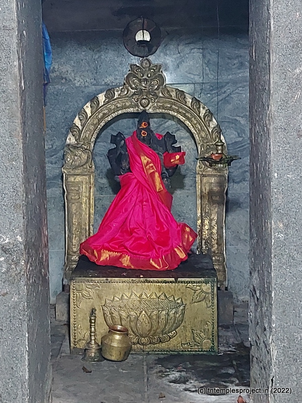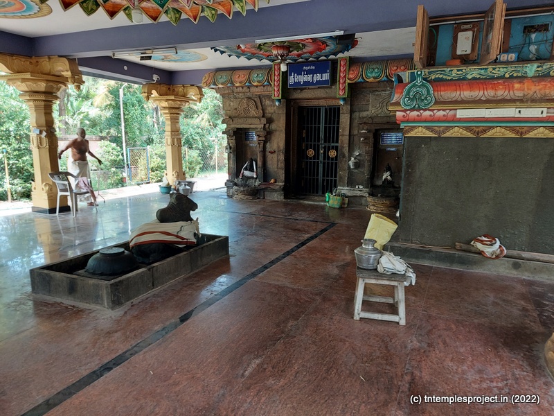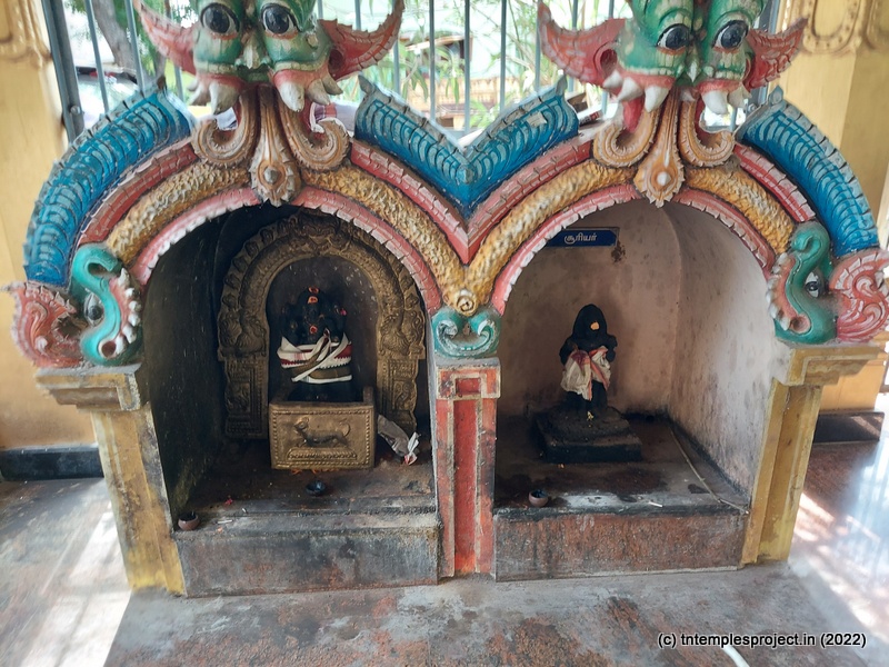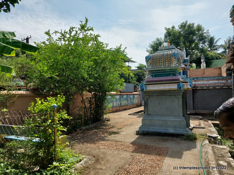 The temple is east-facing and has an entrance arch on that side. However, the main entrance is from street on the northern side, which leads to the maha mandapam. On the right, in the north-eastern corner, is the navagraham shrine.