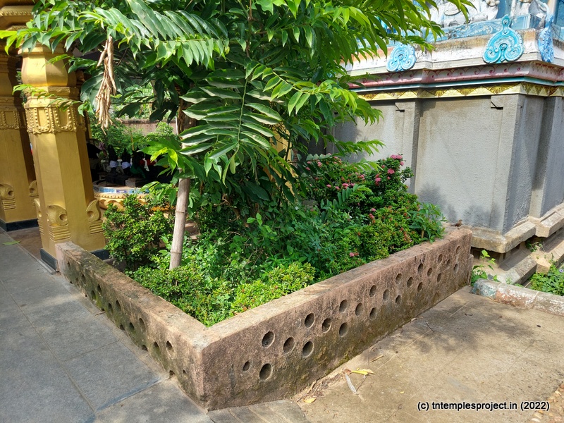 During the temple’s renovation in 2014, the level of the exterior path around the temple was elevated, such that there is a sort of moat between the main temple structure and the outer path. The koshtam vigrahams are also from the time of renovation.