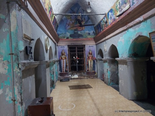 Upon entering the temple, is a long and narrow corridor that takes us to the maha mandapam. In this corridor are a bali peetham and Nandi. The maha mandapam is really a long vavvaal-nethi mandapam, from the Maratha period. The corridor has niches, some of which have vigrahams installed, such as one which has Vinayakar, Kasi Viswanathar and Visalakshi Amman along with Nandi. The ardha mandapam houses the garbhagriham for Kailasanthar and also the Karpagambal Amman shrine.