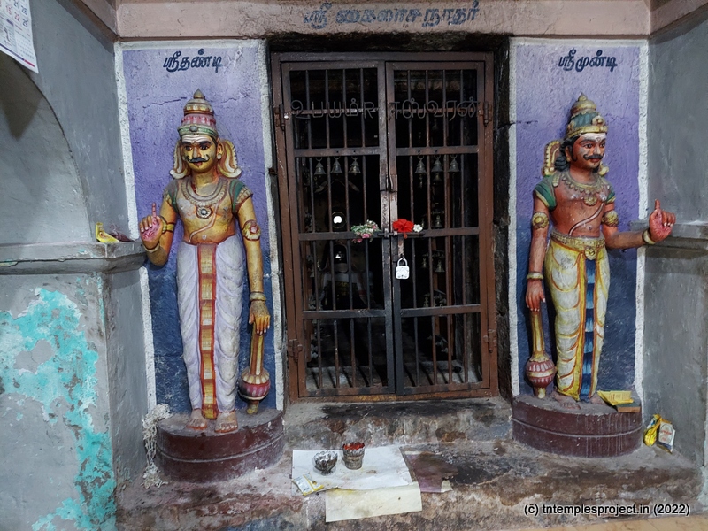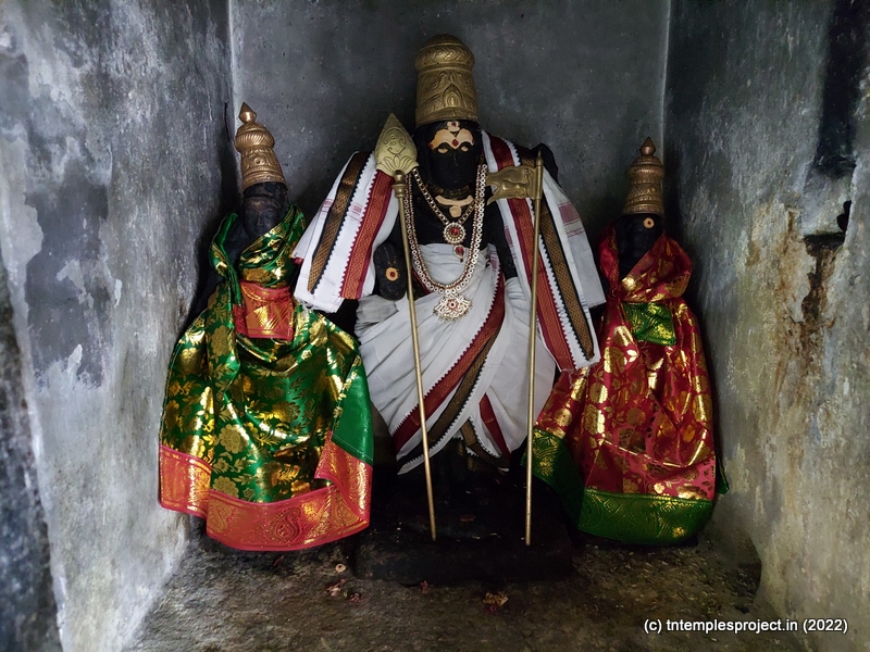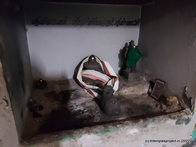In the koshtams are Dakshinamurti, Lingodhbhavar and Durga. In the prakaram are Vinayakar, Murugan with his consorts Valli and Deivanai, a lingam for Lord Siva and Parvati as Sundareswarar and Meenakshi, Chandikeswarar, Kala Bhairavar, Sani, Suryan and Chandran. There is also a separate navagraham shrine.