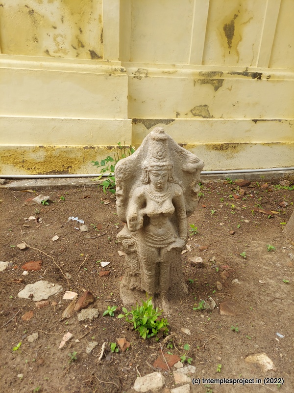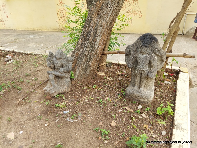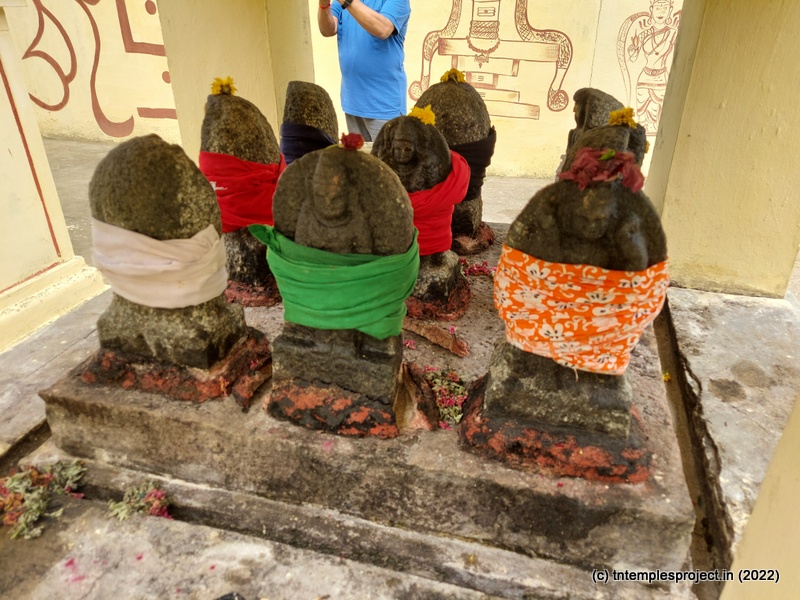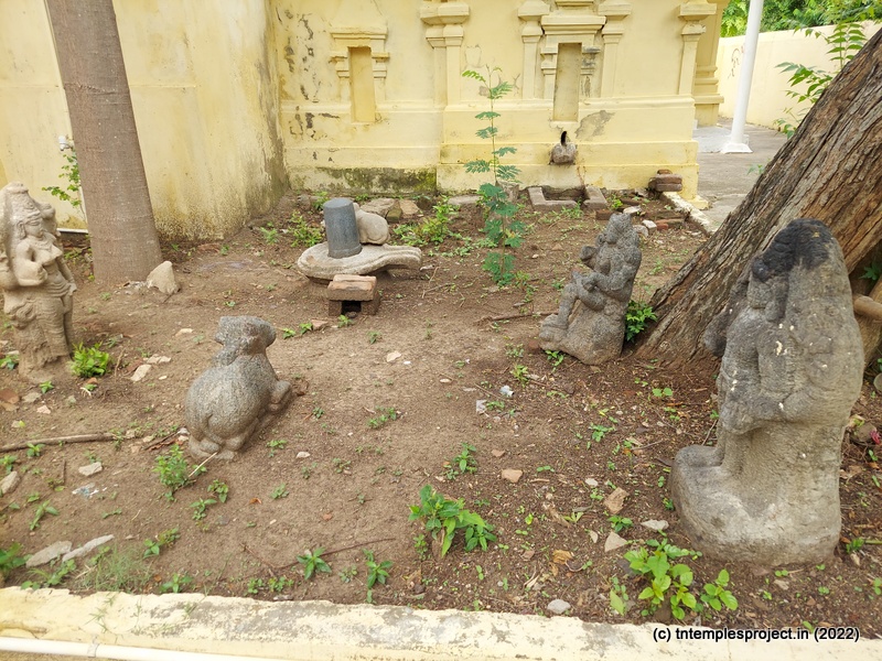 As we come around the prakaram, Dakshinamurti, Lingodhbhavar, Brahma and Durga are in the koshtams. In the prakaram there are shrines for the parivara devatas – Vinayakar, Murugan with his consorts Valli and Deivanai, and Chandikeswarar. In the northeast part is another lingam, and the navagraham shrine. There are several older or damaged vigrahams and lingams strewn around in the open spaces inside the temple premises.