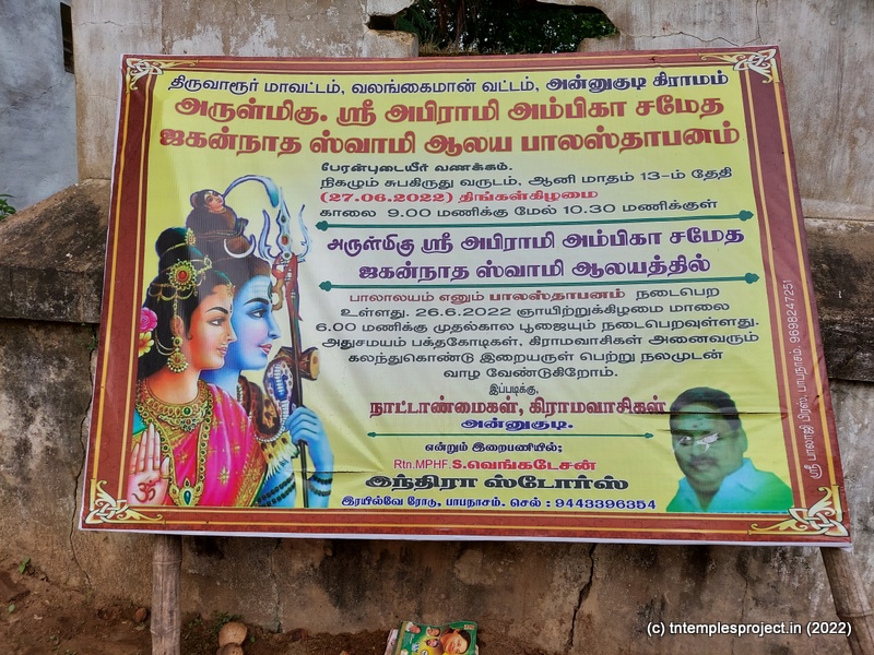 The tiny hamlet of Annukudi is located southeast of Papanasam, on the Papanasam-Avoor road. The village of literally four streets, boasts of two temples of its own – the Lakshmi Narayana Perumal temple for Vishnu, and the Jagannatha Easwarar temple for Lord Siva. The two temples are located almost adjacent to each other.